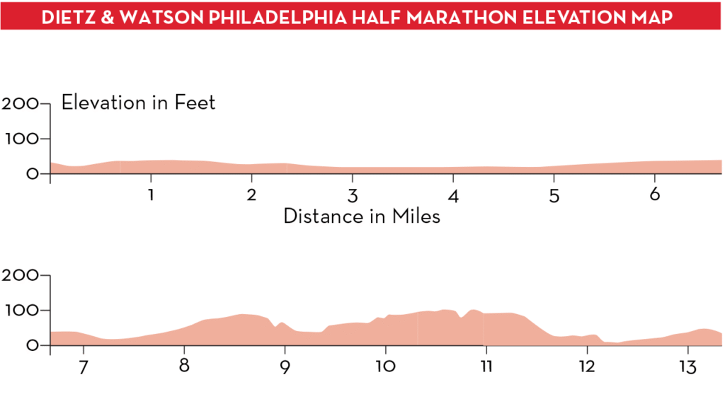The half marathon course begins at the Ben Franklin Parkway, not far from the art museum, and runs through center city for the first half of the race. This portion is fast and flat with no notable climbs. Coming onto Walnut Street, the tough part of the race begins starting with a gradual incline at ~7.25 miles and a short but steeper ascent shortly after turning right onto 34th Street. Cresting the steeper portion, there’s a more gradual climb to ~8.6 miles, after which you get some reprieve as you descend towards the Philadelphia Zoo. Coming to that right hand turn onto Girard Avenue, there’s a smaller hill that levels off as you run over the bridge and take the left onto 33rd Street. This is the last notable hill of the course, spanning from ~9.4 to 10 miles. It’s a very gradual, constant climb that your legs will feel by that point in the race. As you’ll see on the elevation chart, the ascent doesn’t really end until ~10.75 miles, but the worst part is done around the 10 mile marker. As you enter Fairmount Park on Reservoir Drive, you can start to wind down the pace if you’re feeling good. It’s largely downhill and flat from that point onward. Hitting mile 11, you’ll take a left and begin a wonderful downhill followed by an even lovelier descent on Fountain Green Drive. Use the momentum to carry you through the remaining ~1.4 miles on Kelly Drive; there’s one final, gradual ascent that begins as you run by Boathouse Row and the art museum. It’s not bad, but by that point you feel any elevation gain. Cresting that last rise, you’ve got a short, gradual descent to the finish line to fly to a new PR.